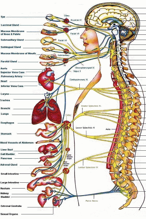 Think of your body like your house. In your house you have a breaker box that all the wires of your house go through, your spine is like that breaker box. If your whole kitchen goes dark, you're not going to look at each different appliance, you're going to look at the fuse box and see what's wrong. Your spine is the same way. If you have heartburn, it may be a problems with the nerves in the middle of the back, constipation may be affected by the nerves in the low back, and headaches often come from the neck, not necessarily from the head.